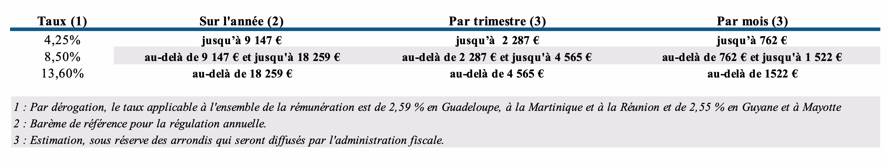 Journalistes : 1,69 % (compte tenu de l'abattement de taux de 20 % applicable) Artistes du spectacle : 1,48 % (compte tenu de l'abattement de taux de 30 % applicable) À noter :