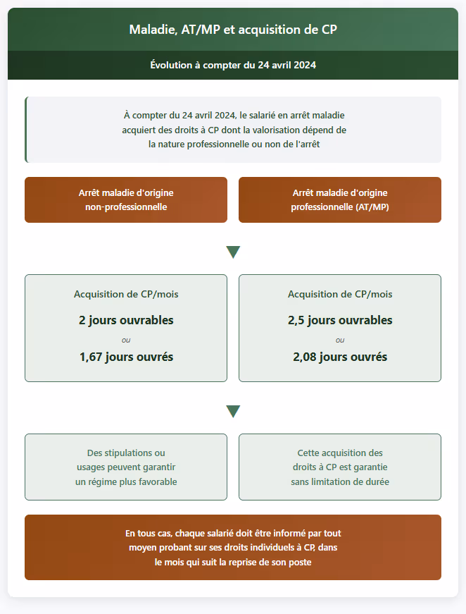 Maintenant : Il acquiert 2 jours ouvrables de congés par mois d'arrêt, jusqu'à 24 jours ouvrables par an maximum. (soit 1.67 jours ouvrés, jusqu'à 20 jours ouvrés par an)